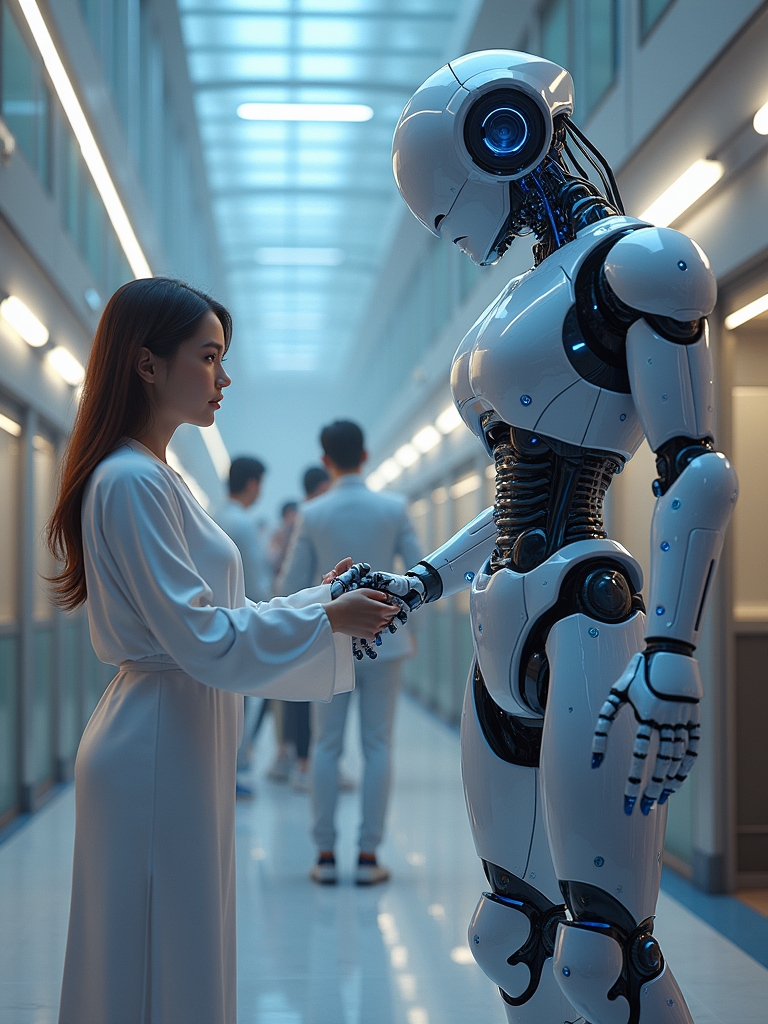 Atrybuty: Daily life with robots assisting humans, hyper-detailed digital painting, silver and blue palette, futuristic yet realistic, cinematic lighting, 8K
